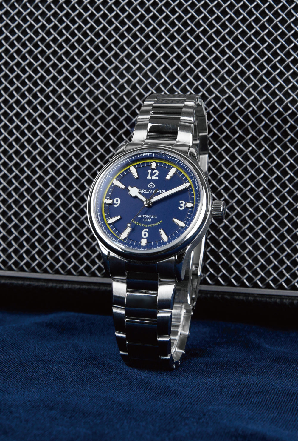 The iconic design of VARON CHIRI, double chapter ring, was adopted to THE HEXAGON. THE HEXAGON boasts an outer chapter ring that extends to the very edge of the rehaut, resulting in a sensational dimensionality. Furthermore, a striking yellow line is positioned the space between the inner and outer chapter rings in THE HEXAGON highlights the casual and sporty look.